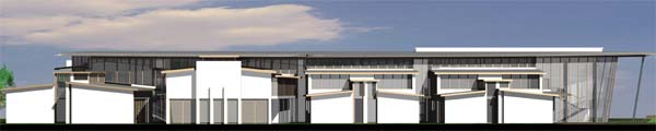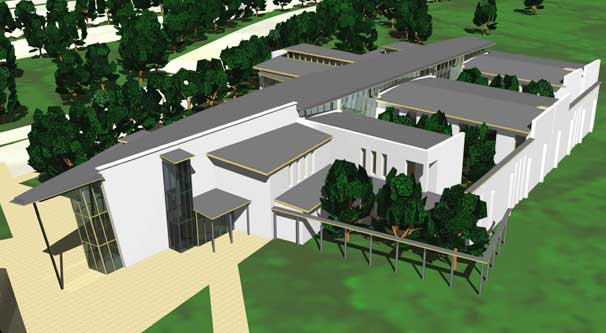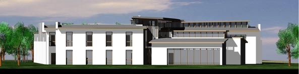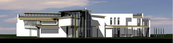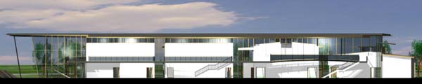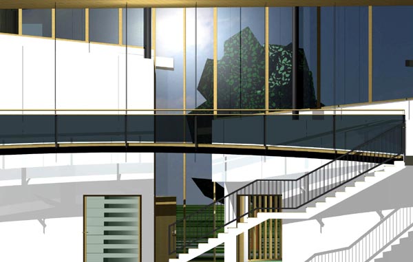 Az épület észak-déli irányú belső tengelyének déli végére tervezték a főbejáratot, amin át a központi közlekedő térbe jutunk majd. Itt lesz majd a ruhatár, a porta, a lift, a lépcsők és az épület déli lezárásaként egy télikert.